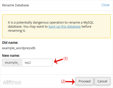 4. Change the database name and click on Proceed.