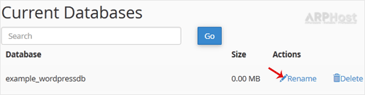 3. Under Current Databases, you can see a list of all your databases. Locate the Database and then click on Rename.