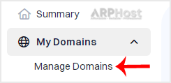 3. Click on My Domains from the left-side menu, then select Manage Domains in the drop-down.