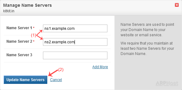 5. Enter the nameservers found in our Welcome Email and click on Update Name Servers.