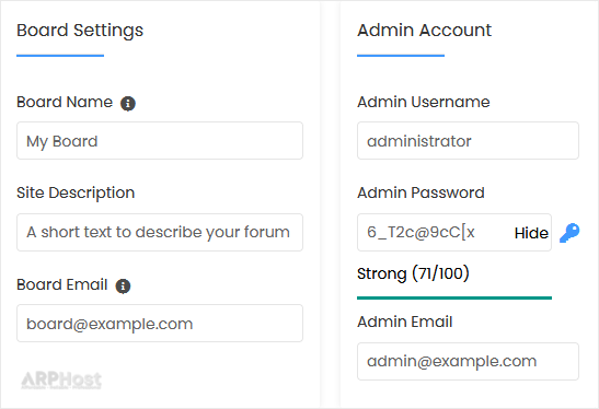 - Admin Username: Your new phpBB username (for security reasons, do not use the administrator or the admin username).