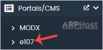 4. On the left side, type e107 in the search box, then click the e107 link that appears.